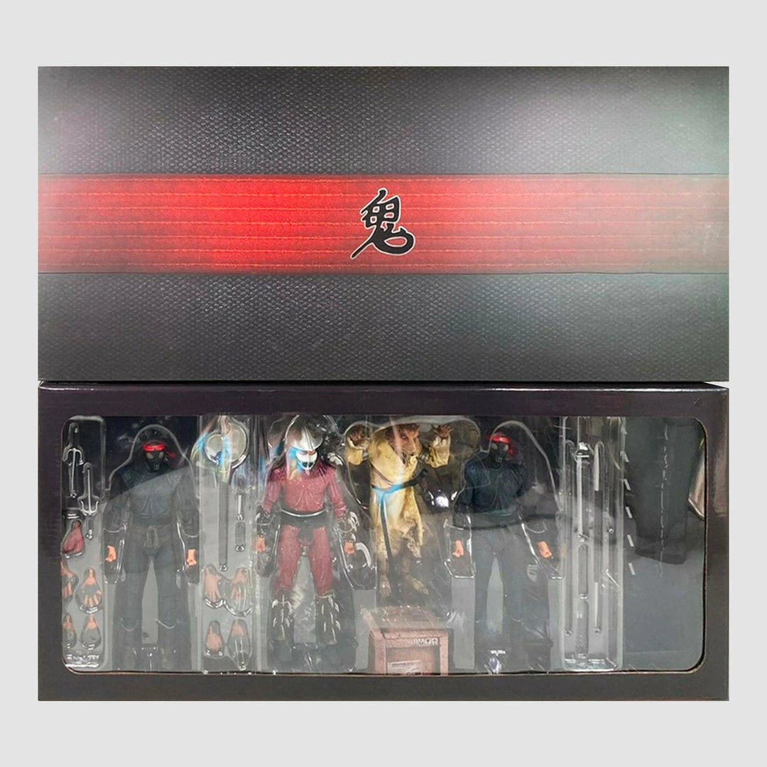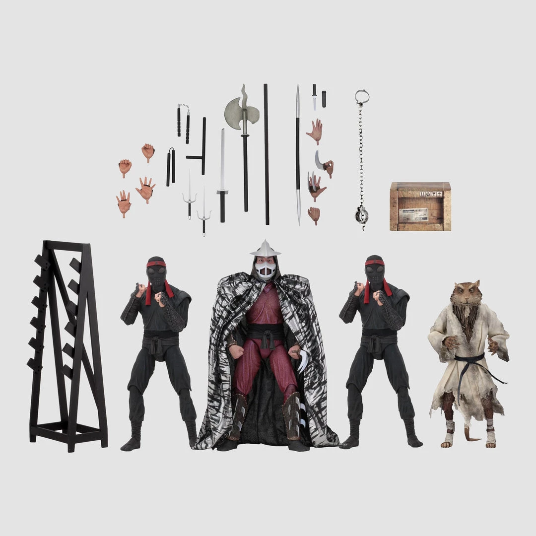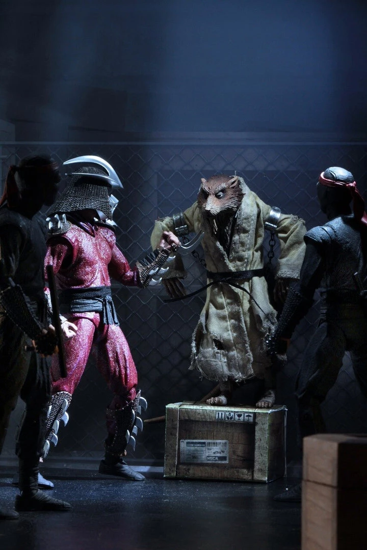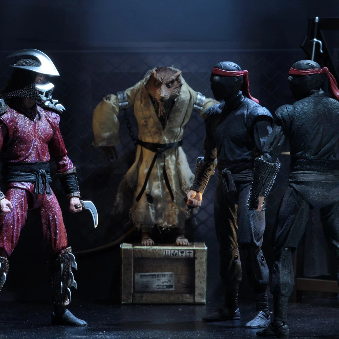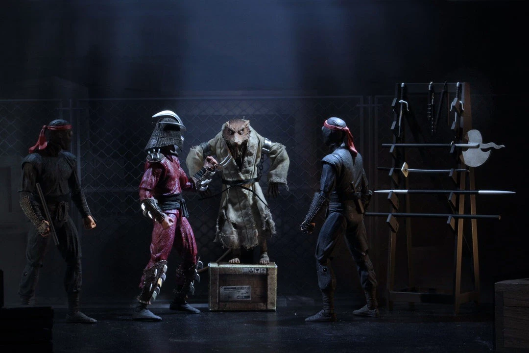 This epic box set recreates the “Capture of Splinter” scene from the 1990 movie in 7” scale, all the way down to the in-box positioning! The set includes Splinter (with cloth robe), Shredder (with cloth cape), and two Foot soldiers, plus plenty of extras: manacles, a cardstock crate, and a weapons rack for storing all the Foot clan accessories.