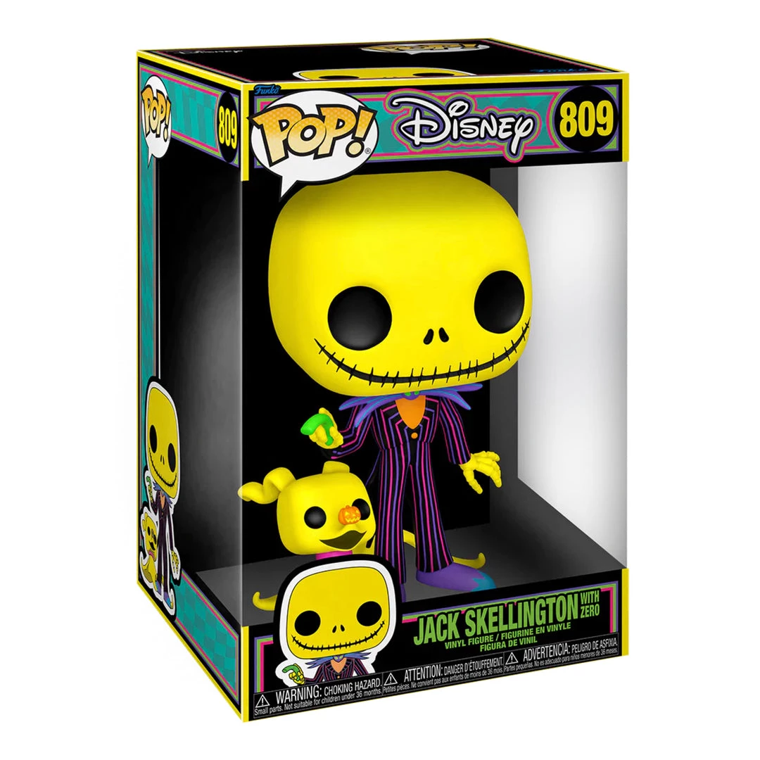 Treat yourself to a fetching addition to your The Nightmare Before Christmas collection! This Jumbo Pop! Jack Skellington with Zero appears in vibrant coloring that is designed to shine brightly under black light. These buddies from beyond are sure to inspire a playfully spooky atmosphere wherever they go. Vinyl figure is approximately 10-inches tall.