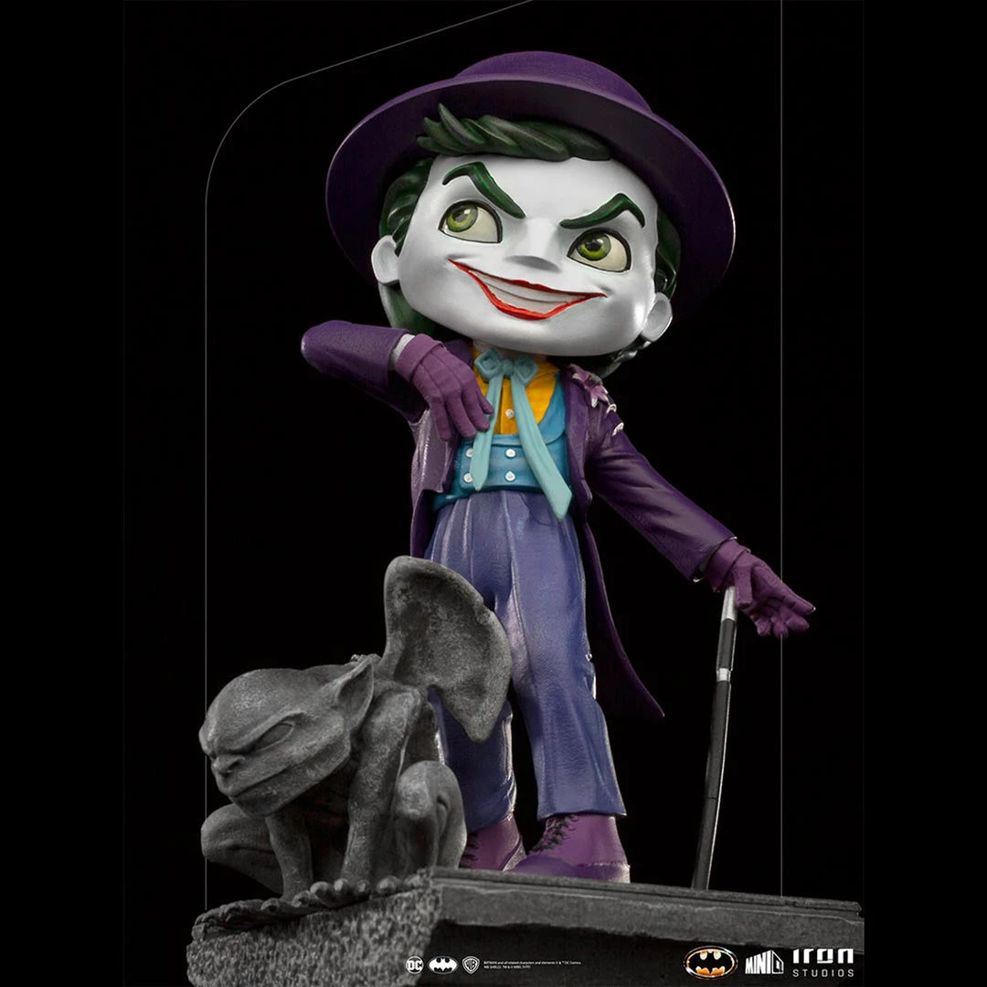 In 1989, the renowned gothic director Tim Burton made history by presenting one of the most memorable adaptations of a comic book hero for theaters with the movie ”Batman”. To celebrate this historic production, Iron Studios presents in its MiniCo line, its version of ”The Joker – Batman 89 – Minico”, with Prince Clown of Crime in Toy Art format, wearing his elegant and peculiar purple suit, adorned with a hat and supported by his cane, the smiling villain poses as if in mockery of his rival next to a gargoyle, both on a base simulating the concrete eaves of Gotham Cathedral, in reference to the decisive confrontation of the antagonists in the film.