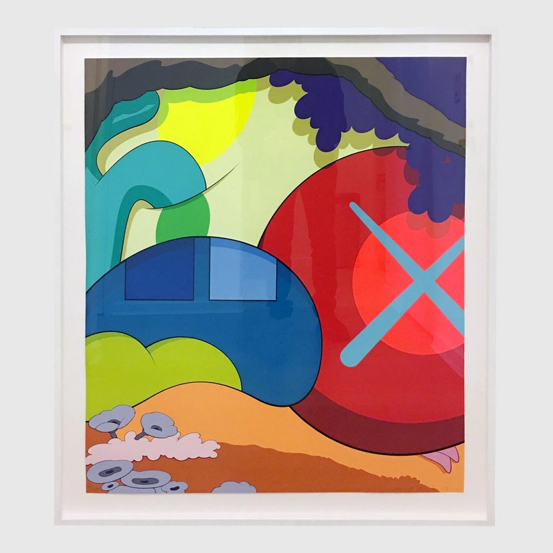“You Should Know I Know,” from Pace Prints, demonstrates the animated, illustrative style and vibrant color characteristic of Brooklyn-based street artist KAWS. Although this work incorporates his trademark “X” eyes and gloved hands, the overall impression of the composition is distinctly abstract, with only the suggestion of a figurative subject matter.