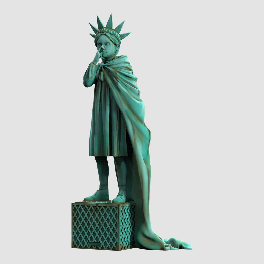 Donning an iconic green do, the second colorway of the popular Liberty Girl wears its inspirations on it sleeves. Standing on a box and picking her nose, Liberty Girl displays a childish arrogance in her play for liberty. Don’t miss your chance to own this remarkable piece of art that is now immortalized as a special edition Polystone figure.