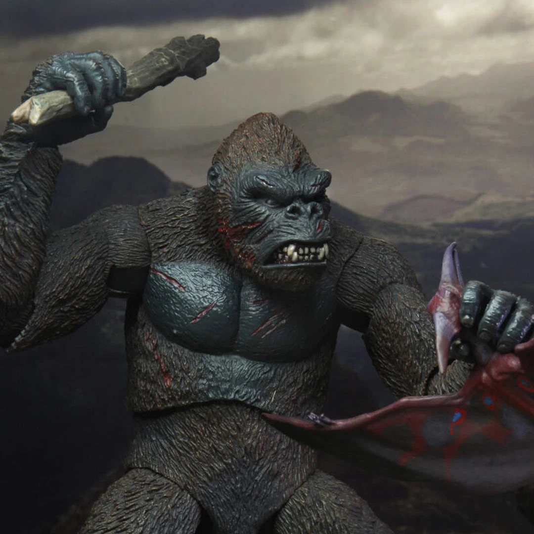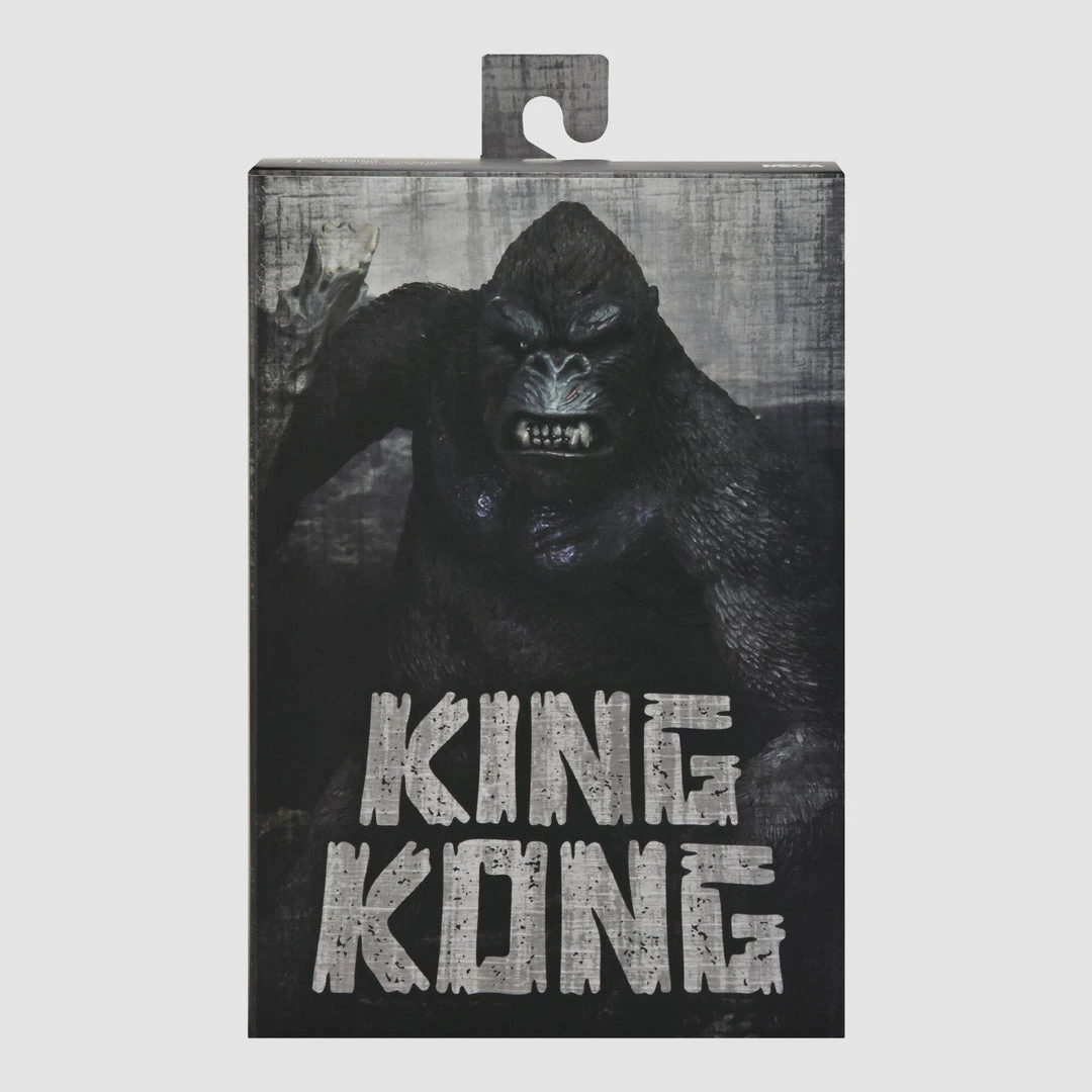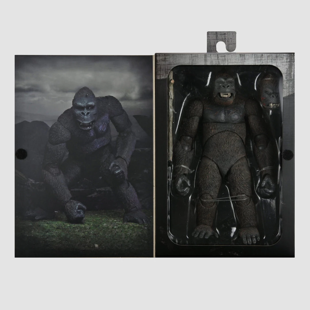 NECA proudly presents the Ultimate King Kong! He stands 8″ tall with super detailed hair and battle wounds across the body and head sculpts, received from defending his island. This massive figure has over 30 points of articulation. The figure includes two brand-new interchangeable heads (one with jaw articulation), 3 pairs of interchangeable hands, a pit monster, pteranodon, and tree trunk accessory. Display-friendly window box packaging with opening front flap.