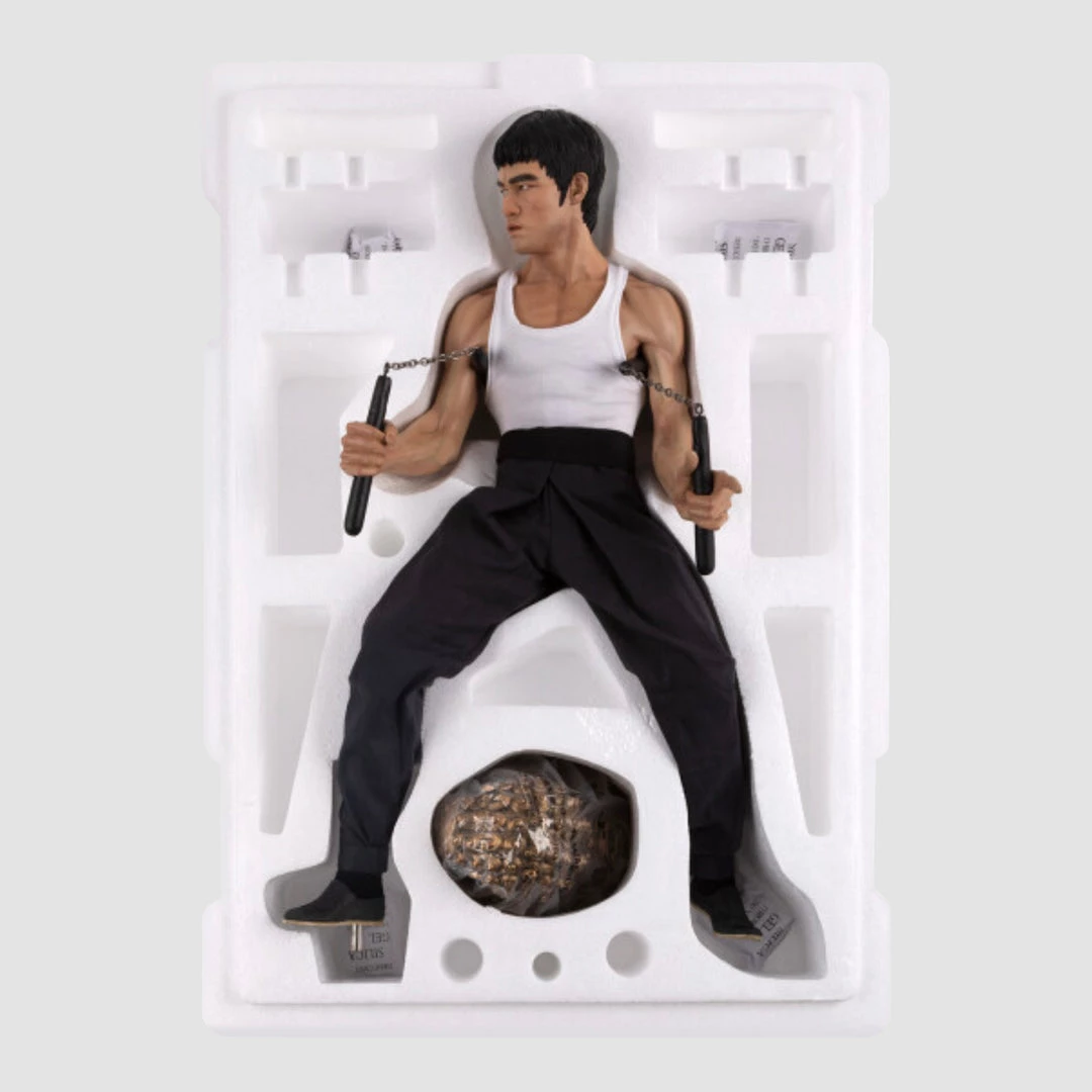Blitzway presents the Bruce Lee Tribute Statue (version 4) in the 1/4th scale Superb Scale Statue series. In this project, the Blitzway design & development team captures Bruce Lee’s signature charisma, full of controlled power. This statue features Bruce Lee’s highly realistic facial expression, his pose that looks like he is confronting the enemy, his rippling muscles sculpture, and two tightly held nunchucks. The stone textured base, engraved with his martial-arts moves, shows his fame as a martial-arts master.