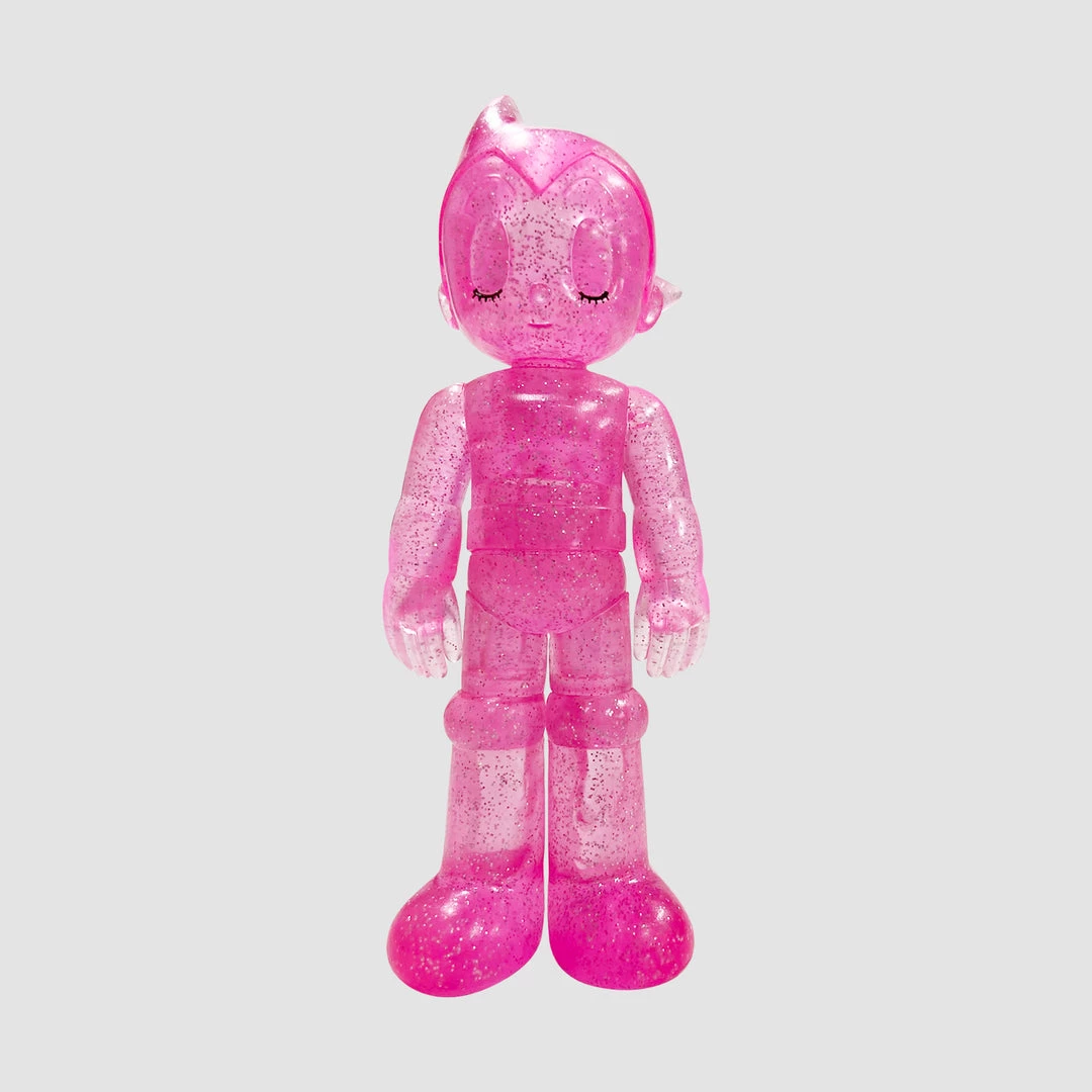 This Astro Boy toy figure made by ToyQube x Tezuka Productions is a classic take on the legendary boy robot. This is the closed eyes Soda Pink edition which features a transparent finish with black eye lashes.