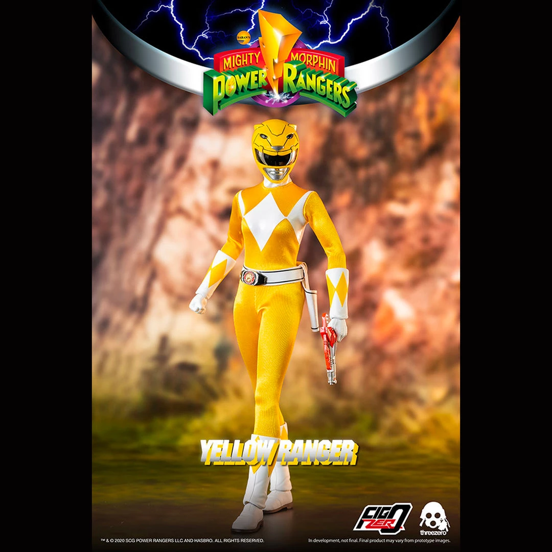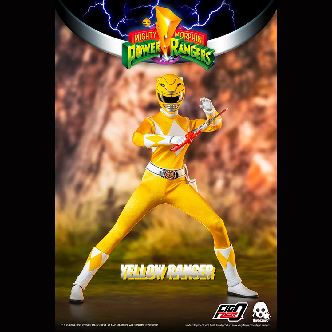The Yellow Ranger Sixth Scale Figure is approximately 12” tall, fully-articulated with hand-tailored fabric costumes, standard boots, and a unique Mighty Morphin helmet. It also includes a utility belt, Blade Blaster holster, Blade Blaster, individual weapons, and four pairs of interchangeable hands.